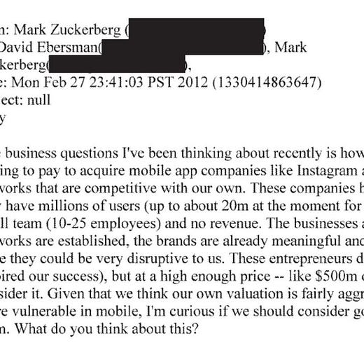 A mais nova polêmica foi a troca de emails entre Mark Zuckerberg, CEO do Facebook, e David Ebersman, antigo CFO da empresa. Os emails são de 2012 e abordam a possibilidade de adquirir outras redes sociais para eliminar a concorrência.